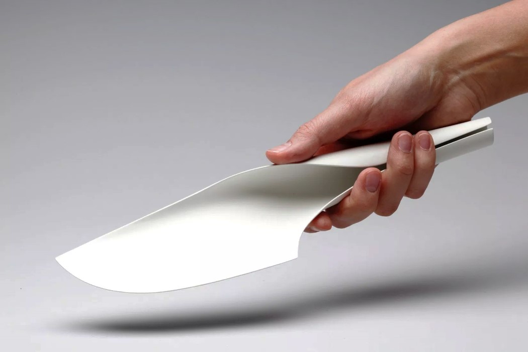 这把刀是用一整块扁平的不锈钢制成的。很结实,它的刀刃很平,可以卷曲成管状,形成一个很好握的刀柄。全唐式设计也给了刀子很大的机动性,这把刀完全由1.5毫米厚的不锈钢薄片制成,没有一个铆钉、螺钉或粘合部件。在这方面,一体式刀是真正的极简主义的标志!