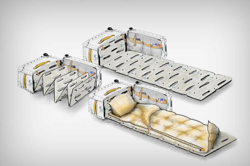 FPM的行李包括一张床、一个厨房和三个手提箱的办公桌